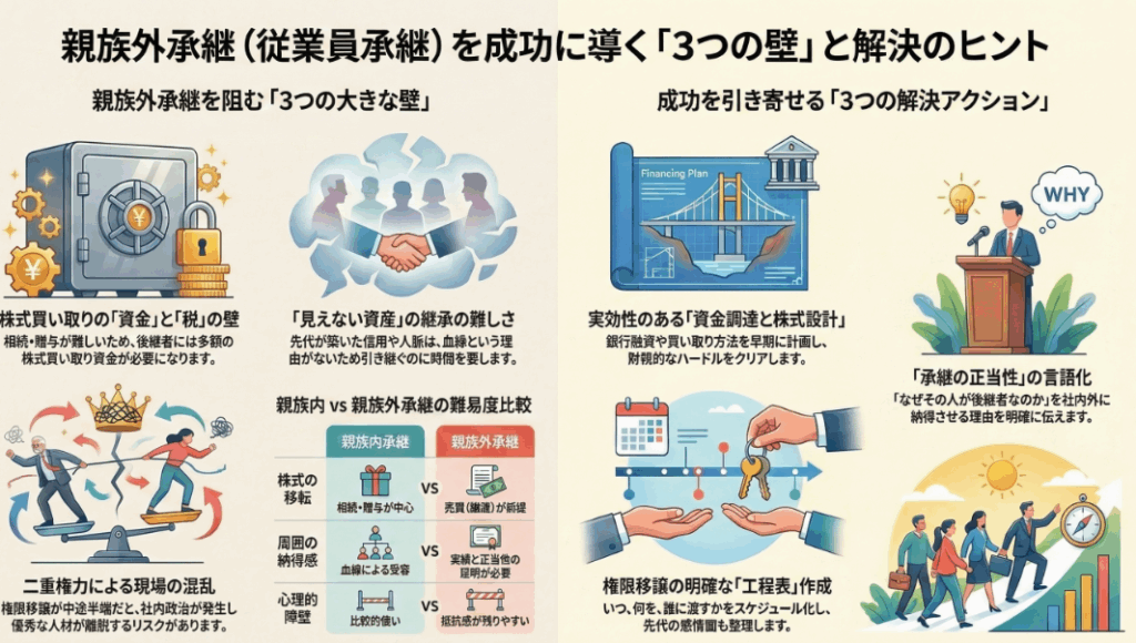 一方で、幹部社員や第三者へ引き継ぐ親族外承継は、理屈では合理的でも、現場では一気に難易度が上がります。